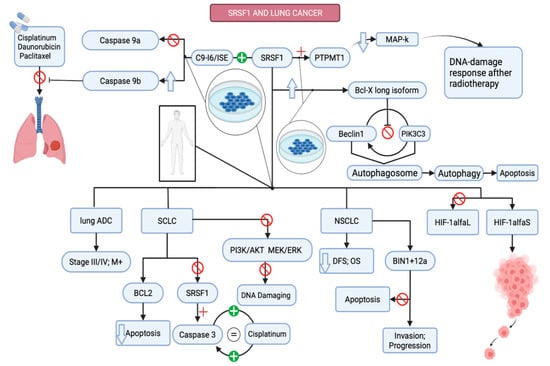 Valid literature concerning the clinical role of SRSF1 in lung cancer started in 2010, when Ezponda T. et al. observed its key role in NSCLS (non-small cell lung cancer) through an mTORC1-dependent mechanism; the activation of the translational repressor 4E-BP1 and the activation of the surviving pathway seems to contribute to NSCLC progression [30]. Another in vitro study with cell culture of NSCLC and RNA transfection showed the role of Caspase 9 in chemotherapeutic sensitivity of non-small cell lung cancer; in particular, an alternative splicing event of Caspase 9, switching the expression ratio of Caspase 9a/9b from 9a to 9b, caused an increasing of resistance from cisplatinum, daunorubicin and paclitaxel. This study also demonstrated that the mutation of the C9-I6/ISE enhancer element, leading to the overexpression of Caspase 9b, is mediated by the interaction of SRSF1 with C9-I6/ISE; therefore, the in vitro study postulated that SRSF1 could be a lung cancer chemoresistance mediator [31].