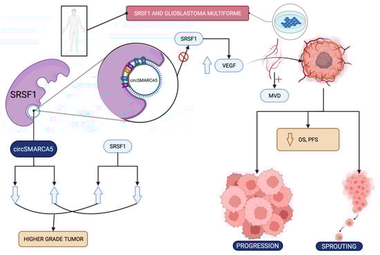 Interesting papers have been published in the last few years regarding glioblastoma multiforme (GBM), an aggressive cancer of the brain. Consequently, with the growing interest in circRNAs (circular RNAs), a new class of RNAs that are highly expressed in the brain, studies have investigated the role of hsa_circ_0001445 (circSMARCA5); in particular, it was found that circSMARCA5 interacted with SRSF1 splicing factor, modulating its activity in GBM cells. Studies have been conducted on sampling biopsies from GBM and surrounding healthy brain tissues collected in a single institution; thereafter, histological and molecular features were correlated with clinical data. In particular, it was found that circSMARCA5 expression was downregulated in GBM, compared to healthy tissue, and the decreased expression of circSMARCA5 matched with a crescent grade of neoplasia malignancy and an in vitro reduce migration-capability of GBM cells [49]. Moreover, the role of circSMARCA5 as a splicing regulator in GBM was investigated and it was revealed that it interacts with SRSF1 leading to an inhibition of this AS factor; in fact, it was found that SRSF1 is upregulated when circSMARCA5 is downregulated in association with an upregulation of VEGF, suggesting that SRSF1 could upregulate the expression of VEGF leading to a more angiogenic activity, cancer progression and sprouting. In this study clinical data suggested that MVD, VEGF and SRSF1 correlate with poorer OS, and progression-free survival (PFS) [50,51]. In conclusion, there is a key clinical role of SRSF1, in association with its regulator circSMARCA5, in cell migration and angiogenic potential for GBM. The interaction between SRSF1 and circSMARCA5 is a key factor to try to individuate new possible pharmacological or gene therapies for GBM, with this perspective it was found that the “GAUGAA” motif in circSMARCA5 is responsible for the binding of SRSF1 and enhancing the angiogenic potential and cell migration of GBM [52].