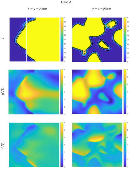 where is ith component of the normal vector based on the flame brush and is a model parameter of the order of unity. Based on Equation (4), Veynante et al. [28] defined a nondimensional parameter known as the Bray number to decide if the velocity jump across the flame brush due to heat release is greater () or smaller () than the turbulent velocity fluctuations. For cases A–C, the Bray number is given by and , respectively, based on the initial conditions, which shows that the Reynolds stresses in case A are likely to be dominated by effects of heat release, whereas cases B and C are increasingly influenced by turbulent velocity fluctuations. By contrast, the large-scale strain rate in the context of RANS can be scaled as [30], whereas the strain rate induced by thermal expansion can be scaled as [31]. Therefore, the ratio of the strain rates induced by thermal expansion due to heat release to the large-scale turbulent strain rate can be scaled as [31]. The values of in Table 1 reveal that the influence of is likely to progressively weaken in comparison to the effects of from case A to case C. Thus, the statistics of in case A are likely to be strongly influenced by heat release, whereas these statistics are expected to be influenced by turbulent straining in case C. The relative strength of thermal expansion in comparison to the background flow turbulence will affect the flow anisotropies as discussed in Section 4.