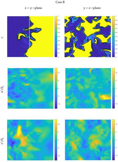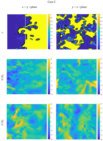 Figure 1, Figure 2 and Figure 3 show the instantaneous distribution of reaction progress variable with superimposed isocontours corresponding to for cases A–C in two different sections cutting the computational domain in and direction. In all figures, the flame propagates from right to left along the negative x-direction. In this context, the reaction progress variable is defined based on the reactant mass fraction as follows: where the subscripts 0 and refer to the values in the unburned reactants and fully burned products, respectively. It can be observed from Figure 1 that -isosurfaces are mostly parallel to each other in case A, whereas the isosurface is more distorted than the in cases B and C. The Karlovitz number increases from case A to case C (see Table 1), which results in a larger length scale separation between and . As a consequence, energetic turbulent eddies are more likely to perturb the preheat zone for high values of and local flame thickening can be observed in case C. Furthermore, it can be also observed from Figure 1, Figure 2 and Figure 3 that flame wrinkling increases from case A to case C. While turbulent structures tend to be relatively isotropic for cases B and C, case A clearly shows larger structures for the velocity fluctuations which are aligned with the mean flame propagation direction (i.e. ) compared to those which are normal to the -direction (e.g., ).