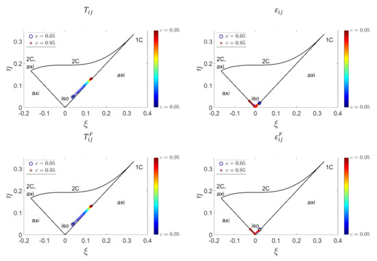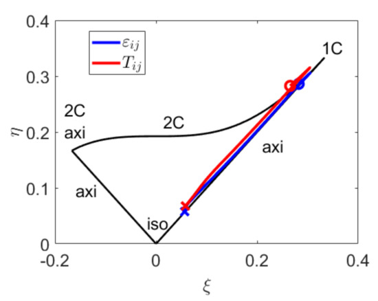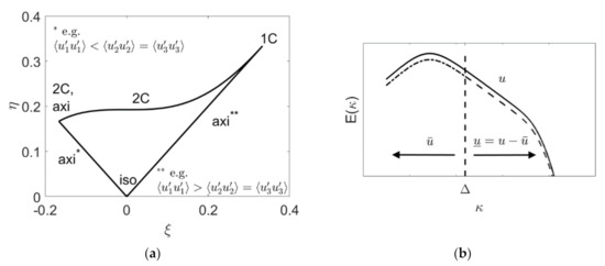 Two borders are given by the straight lines connecting the origin (0,0) with the points () and (), respectively, while represents the third, curved border. Any physically realizable state of the anisotropy tensors has to lie within this triangle and the borders, sketched in Figure 4a, represent an axisymmetric contraction (left border), axisymmetric expansion (right border) and the two-component state, respectively, while the origin demarks the isotropic state [2]. Coordinates and are nondimensional quantities; thus, the Lumley triangle provides a general framework for the parameterization of anisotropy.