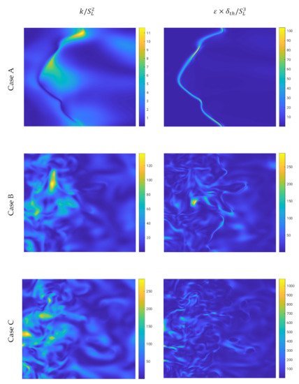 Instantaneous distribution of normalised turbulence kinetic energy (left) and normalised dissipation in the plane for top-bottom cases A–C. The flame propagates from right to left along the negative -direction. The field of view represents the computational domain of dimension .