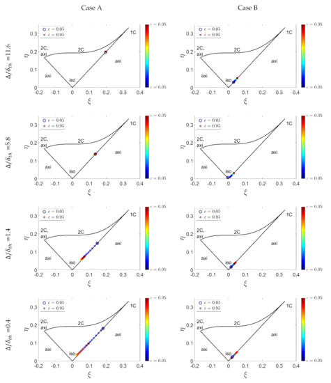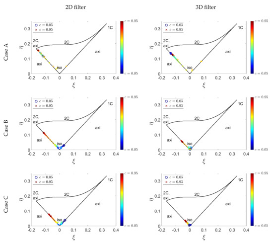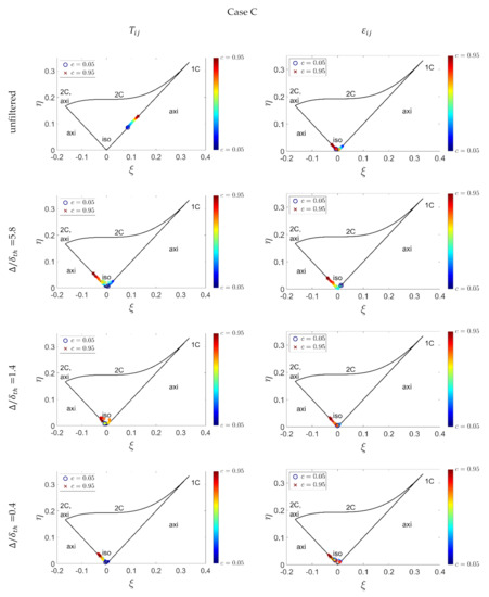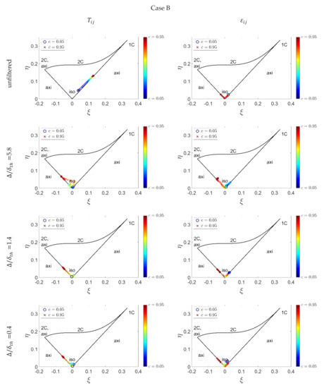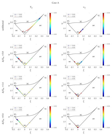 For a high pass filter of width , flow structures smaller than are retained such that the second, third and fourth row in Figure 9, Figure 10 and Figure 11 represent increasingly small flow structures. For case C, the following behaviour is as expected: Both tensors and tend to become more isotropic with decreasing filter width . Isotropy, in particular, increases once the filter becomes smaller than the integral scale (i.e., according to Table 1). By contrast, case A shows an unexpected behaviour and the turbulent state switches from axisymmetric expansion (lower right border) to the axisymmetric contraction side (lower left border) with a decrease in , but considerably anisotropy can be observed even for the smallest filter width considered here.