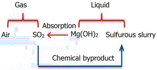 As shown in Figure 1, air and SO2 gas are the components of gas phase, and the sulfurous slurry and magnesium hydroxide (Mg(OH)2) are the components of liquid phase. The Mg(OH)2 solution removes the SO2 gas phase by absorption, and new chemical by-product, namely sulfurous slurry, is generated in the liquid phase. The SO2 gas is less than 130 ppm, and hence it is reasonable to assume that the corresponding phase change in Figure 1 does not really affect the continuity and momentum equations. Therefore, the source term related to chemical reactions is absent in Equations (1) and (2) [,,,]