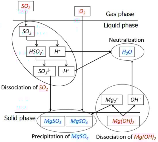 Figure 2 illustrates the chemical reactions during the desulfurization process. In the upper left corner of Figure 2, it indicates that the SO2 gas dissolves into liquid phase and hydrates to form SO2∙H2O. One proton is lost and HSO3− is generated because of the dissociation, and HSO3− has subsequent dissociation to lose another proton and form SO3−2: