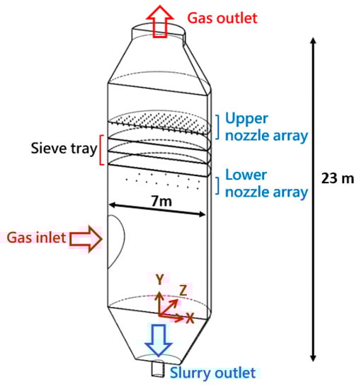 Figure 4 illustrates the full-scale FGD tower. The height and diameter of the tower are 23 and 7 m. The tower has three sieve trays, and the gas is transported by a pipeline with diameter of 3.6 m and it leaves the domain from the outlet with a diameter of 3.6 m. There are two sets of nozzle arrays. One is above the highest tray by 1 m with 192 nozzles, and the other is below the lowest tray by 1.2 m with 29 nozzles. Both sets of nozzles have spray angle of 65°and diameter of 0.05 m. The experiments for both small- and large-scale towers have already been conducted by China Steel Cooperation [] with measured data for desulfurization and pressure at designated sampling points.