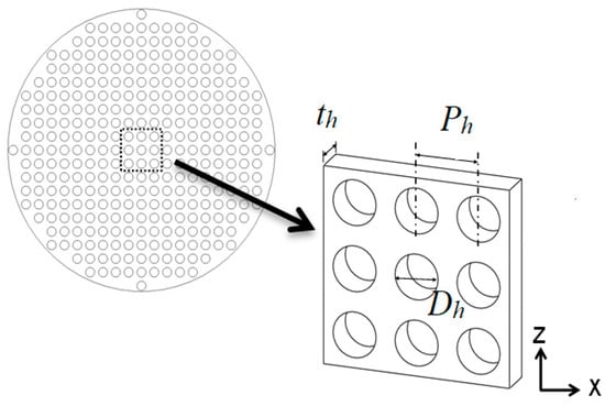 The perforated hole structure on a sieve tray is illustrated in Figure 5 from the top view (left) and side view (right). For the small-scale tower, the important parameters required to determine the inertial loss coefficient C in Equation (16) are listed in Table 1 for different cases and phases. The hole diameter Dh is 20 mm, the tray thickness th is 15 mm, and the pitch Ph is 28.8 mm. With the aligned layout shown in Figure 5, the hole diameter Dh and pitch Ph can determine the porosity fh as 34.3%. The hole Reynolds number for gas phase Reh,g = ρgVgDh/fhμg is 5130, where ρg and μg are the density and dynamic viscosity of the gas phase, and Vg (1.4 m/s) is the cross-sectional average velocity of the gas phase within the tower. L/G is defined as the mass flow rate ratio of the total liquid to the exhaust gas. There are two setups for the small-scale tower, and this value varies as 4.9 or 3.2 for the small-scale tower, namely, Case 1 and 2. For Case 1, the velocity of the liquid solution is 0.766 m/s from each spray nozzle with a diameter of 0.01 m, and the velocity of Case 2 is 0.511 m/s. Similar to gas phase, the hole Reynolds number for liquid phase Reh,l is 860 and 570, respectively.