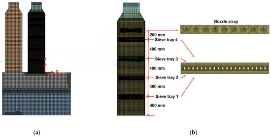 The figure displays the grid distributions of the small-scale FGD tower at the symmetric plane (z = 0) in (a) and the detailed layouts for the right tower near the sieve trays and nozzles in (b).