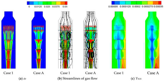 The figure displays (a) the liquid volume fraction, (b) streamlines of gas flow, and (c) the mass fraction of SO2 within the right tower of the small-scale FGD facility for Case 1 (real perforated structure) and Case A (porous media model).