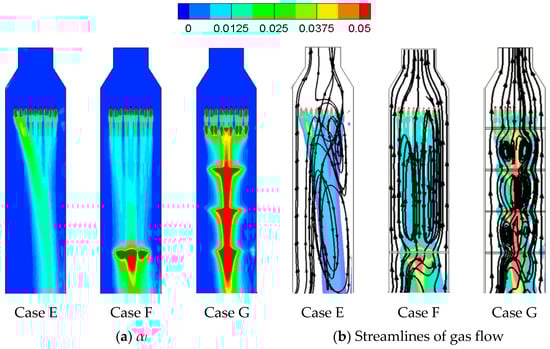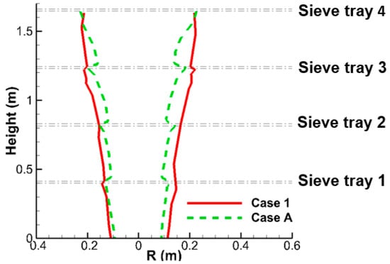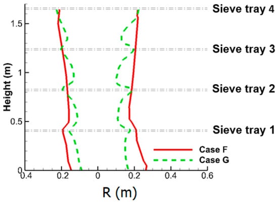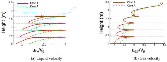 Figure 7 displays the liquid volume fraction (αl), streamlines of gas phase, and the mass fraction of SO2 (YSO2) within the right tower of small-scale FGD facility for Case 1 and Case A at L/G = 4.9. Both cases of perforated structures and porous media model have similar flow patterns. Figure 8 presents the liquid flow velocity (ul,y) and gas flow velocity (ug,y) in the y-direction along the centerline of the small-scale tower for Case 1 and Case A, and the velocity is normalized by average gas velocity Vg (1.4 m/s). The dashed lines display the positions of sieve trays. It is clear that the downward liquid flow in Figure 8a accelerates between each sieve tray and decelerates as the liquid flow approaches the sieve tray.