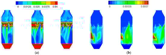 The liquid droplets are usually regarded as a dispersed phase in the Eulerian–Lagrangian model with tracking of a large number of particles []. The droplet is usually regarded as a parcel which contains the same properties [,,,,]. The drag coefficient of the particle is determined by the relative Reynolds number, which is based on the slip velocity between the liquid and solid phase. The drag force of a particle usually feeds back to the continuous phase as two-way coupling [,]. The chemical reaction is modelled by dual-film theory, Henry’s Law [,,], and Chilton–Colburn analogy []. Under the aforementioned framework, Marocco and Inzoli [] have simulated the hydrodynamics and chemical reaction for a dispersed liquid droplet within an open spray tower. Eight dissolved species from gas to liquid phase are considered during the desulfurization process, and the deposition and splashing of liquid particle as they hit the wall of tower are handled by an empirical droplet–wall interaction model. Qu et al. [] evaluated the effect of droplet diameter. A finer diameter benefits the mass transfer but could reduce the uniformity of the liquid–gas flow, and vice versa for a particle of larger diameter. An optimal diameter such as 200 μm was selected based on their simulations. Qu et al. [] further investigated the flow structures at different region of the tower, and the two-phase mixing is stronger in the middle region that dominates the desulfurization process. The evaporation occurs at the inlet region of the gas phase, which only has minor influence on the desulfurization performance. Xu et al. [] investigated the CO2 removal efficiency by NH3 solution and the effect of the layout of the nozzle spray. A fraction of upward gas can be allowed to flow downward by the entrainment effect of the downward spraying liquid. An upward spray at a lower altitude can enhance 7% removal efficiency from a downward spray at a higher altitude because the former offers a longer residence time and increases the droplet volume fraction.