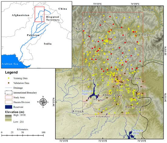 The northern areas of Pakistan are known for various natural hazards such as earthquakes, landslides, and floods []. One of the worst earthquakes in October 2005 (Mw = 7.6) left behind more than 80,000 deaths and a huge loss to infrastructure [] and gave rise to slope failure events. This single event destabilized a large number of slopes in this part of the country. The central part of the study area under investigation constitutes the Hazara Division of the Khyber Pakhtunkhwa province of Pakistan, including part of Azad Jammu and Kashmir (AJK) in the east, Gilgit in the north, and Islamabad (the capital city of Pakistan) in the south. Geographically, the study area extends between 72°30′30.16″ E, 33°42′48.92″ N and 74°11′46.64″ E, 35°51′28.29″ N with an elevation range from 211 to 8558 m (Figure 2).