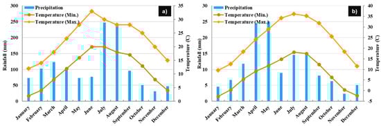 Monthly average temperature and precipitation (a) northern sone (b) southern zone.