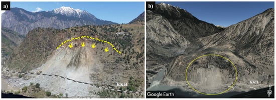 In prediction and susceptibility modeling, it is typically assumed that an event that occurred in the past can occur again in the future at the same place or other places under similar conditions. Therefore, a landslide inventory is imperative for assessing the link between past events and landslide influencing factors. However, the records of such events (i.e., landslide inventories) are often limited to events that occurred at large scales in accessible areas, lacking the details of small-scale events in inaccessible regions [,]. To overcome this limitation of the inventory in the study area, a database (inventory) of past landslides, including rockfall, topples, slides, and debris flow events, was developed by integrating the historic records from Frontier Works Organization (FWO), Geological Survey of Pakistan, and from the databases published in [,,]. Google Earth (GE) images were used to validate geospatial locations and hotspots of these events. Figure 4 represents an example of the landslide event that occurred near the Dasu area, which can be easily interpreted on the GE image shown in Figure 4b.
