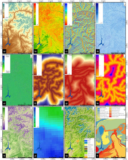 A Landsat-8 OLI image on 27 October 2017 and a Shuttle Radar Topographic Mission (SRTM) Digital Elevation Model (DEM) were obtained from United States Geological Survey (USGS) Earth Resources Observation and Science (EROS) data center. The data were preprocessed to develop a land-cover/land-use (LCLU) map; normalized difference vegetation index (NDVI); and subsequent topographic parameters such as slope, aspect, topographic wetness index (TWI), and topographic position index (TPI). Geological layers and fault lines were extracted from the maps published by the Geological Survey of Pakistan in 1993 and 1982, which were further modified from []. Other toponyms, such as catchments, roads, and drainages, were extracted from topographic sheets developed by the Survey of Pakistan (SoP). Due to limited ground weather stations in the area, time-averaged monthly precipitation data product (GPM_3IMERGM) of Integrated MultiSatellite Retrievals for the Global Precipitation Measurement (GPM) mission (IMERG) for the year 2017 was processed to generate the annual precipitation layer.