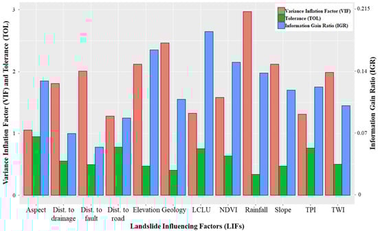 The accuracy of the model output strongly depends on the quality of influencing factors, which require prior knowledge of the terrain. Adding a large number of influencing factors into the model does not always ensure the reliability and accuracy of the modeled results and can introduce abnormalities in modeling processes. Therefore, it is necessary to evaluate the incorporated factors before using them for susceptibility modeling. For this purpose, in this study, all 12 selected influencing factors were scanned through the two tests, i.e., information gain ratio (IGR) [] and multicollinearity []. The IGR test, as provided in Equation (1), is a well-known feature selection method in ML, which is used to assess the contribution of factors, whereas the multicollinearity test was performed to evaluate the interassociation (the linear relationship between two or more factors) [].