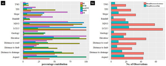 The independent importance of an influencing factor is one of the most significant analyses in ML. The role of the influencing factors and their contribution to modeling plays a vital role in achieving reliable results. In this study, the factor importance in regard to all of the five models was first assessed using the varImp function of the ‘caret’ package. This function calculates and documents the mean decrease (scaled) of accuracy in ‘class-specific’ manners. The details of the contribution of these factors in each model are shown in Figure 7a. It can be observed in Figure 7a that during modeling through the RF and GBM approaches, LCLU was the most significant contributing factor. On the other hand, elevation took the lead in the SVM and LR models, and aspect was the most significant contributing factor in the maxENT model. The varying nature of the factor contribution in the different models reflects the working behavior of these models. Therefore, keeping in view the contribution of these factors, each model provided different results in terms of prediction (Figure 8).