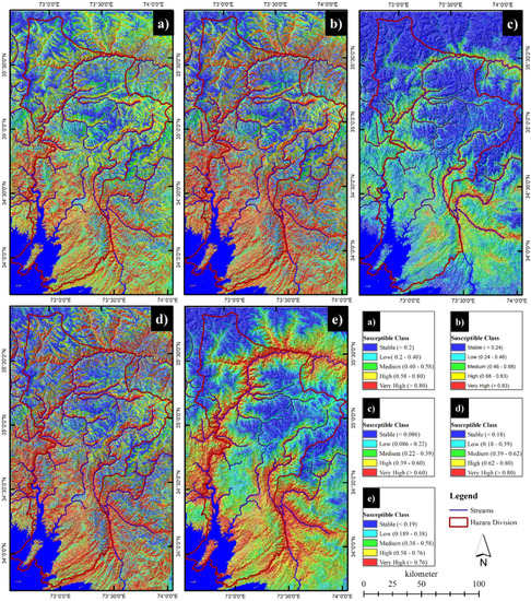 Some recent landslide events in the area also helped to validate the results of modeled landslide susceptibility. For example, eight landslide events occurred along Mansehra–Naran–Jalkhad (MNJ) Road on 26 July 2019, resulting in the destruction of several houses and a road blockage for days, with some causalities []. Another landslide event occurred on 15 July 2019 along the Muzaffarabad–Abbottabad road, resulting in the blockage of the road for two days. Figure 12f shows the Google Earth image of the landslide section (black polygon) along MNJ road near Jared town. The modeled outputs along this region from all five models are shown in Figure 12a–e, and it can be seen that this landslide section has been modeled and categorized as mostly in the high- and very-high-susceptibility classes in all the investigated models.