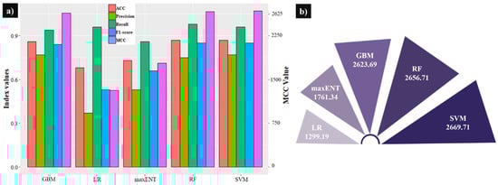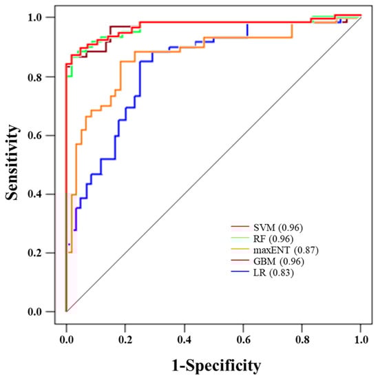- During the validation process, using 30% of the samples, the results showed that SVM (AUC = 0.969, POA = 2669), RF (AUC = 0.967, POA = 2656), and GBM (AUC = 0.967, POA = 2623) were the top three performers, leaving behind maxENT (AUC = 0.872, POA = 1761) and LR (AUC = 0.836, POA = 1299). The validation through the calculation of other parameters (precision, recall, ACC, F1 score, and MCC) showed a similar trend in terms of the performance sequence of the models.