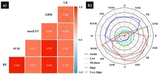 Model comparison: (a) correlation between models, (b) spider graph of SVM vs. slope aspect.