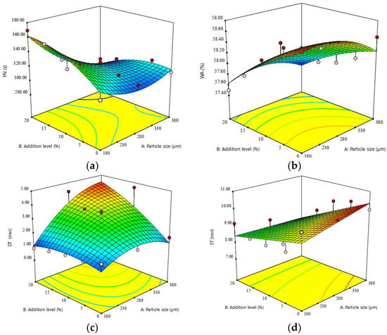 Response surface graphic of (a) falling number (FN), (b) water absorption (WA), (c) development time (DT), and (d) dough stability (ST) as a function of buckwheat flour fraction and addition level.
