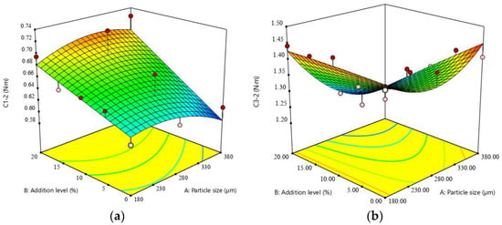 The falling number was negatively influenced by particle size, and a decrease in this parameter was observed with increasing PS (Figure 1). The linear and quadratic effect of the level of buckwheat addition in wheat flour had no significant (p ˃ 0.05) effect on FN, while the interaction between factors led to a considerably lower FN with increasing interaction between the factors.