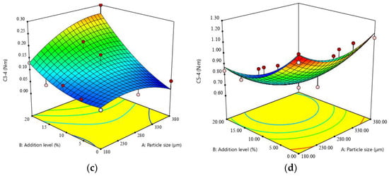 Response surface graphic of (a) protein weakening (C1-2), (b) starch gelatinization (C3-2), (c) cooking stability (C3-4), and (d) starch retrogradation (C5-4) as a function of buckwheat flour fraction and addition level.