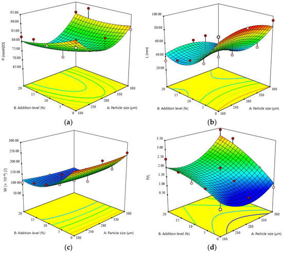 Response surface graphic of (a) dough tenacity (P), (b) dough extensibility (L), (c) deformation energy (W), and (d) alveograph ratio (P/L) as a function of buckwheat flour fractions and addition level.