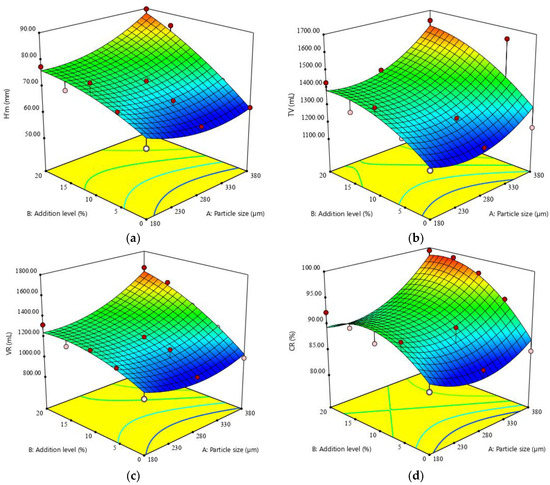 Response surface graphic of (a) maximum height of the gas release curve (H’m), (b) total volume of gas produced (TV), (c) volume of gas retained in the dough (VR), and (d) retention coefficient (CR) as a function of buckwheat flour fractions and addition level.