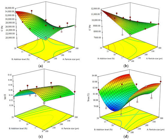 Response surface graphic of (a) storage modulus (G′), (b) loss modulus (G″), (c) loss tangent (tan δ), and (d) maximum gelatinization temperature (Tmax) as a function of buckwheat flour fractions and addition level.
