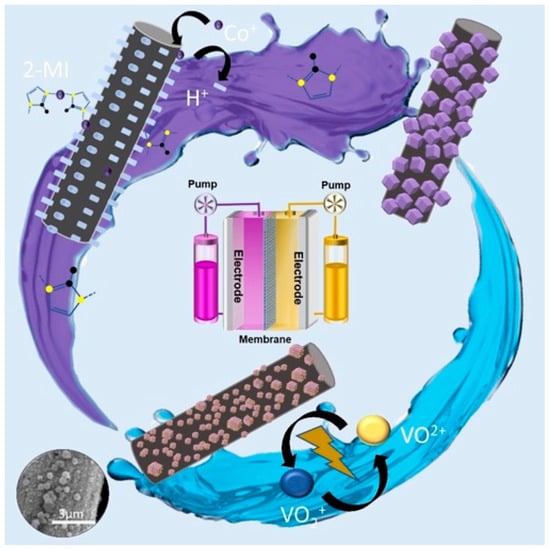 Recently, carbon-based electrodes such as activated carbon (AC), carbon nanoparticles, carbon nanotubes, and graphene-based nanosheets have been widely studied. These can improve the specific surface area of a CF electrode and catalyze the redox reaction, but its resistance will be higher. So, the combination of carbon-based materials with metal elements has been studied in order to effectively catalyze the vanadium redox couples. For example, platinum with high electric conductivity and stability was mixed with carbon black and graphene. Tseng et al. [32,33,34] investigated the reaction rate of VRFBs by PT/C (Vulcan XC-72). It was reported that the Co-based metal–organic framework (Co-MOF) ZIF-67 was a perfect carbon material for lithium batteries due to its porous structure. GE et al. [35] reported on a GF electrode that was pasted with CoP that could effectively promote the V(Ⅳ)/V(Ⅴ) redox reaction, and the CoP power was synthesized by direct carbonization of ZIF-67.