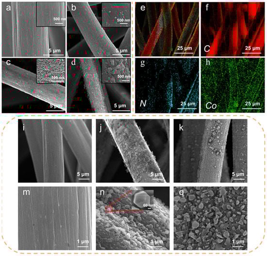 SEM images of ZIF-67 at different times: (a) before treatment; (b) after 5 h; (c) after 12 h; (d) after 20 h. (e–h) EDS images of the ZIF-67@CF. SEM images of: (i,m) CF; (j,n) ZIF-67@CF (after 24 h); (k,q) Co-CN@CF.