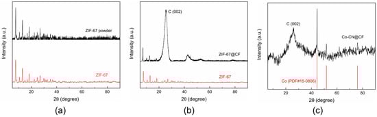 XRD results: (a) ZIF-67 powder; (b) ZIF-67@CF; (c) Co-CN@CF.
