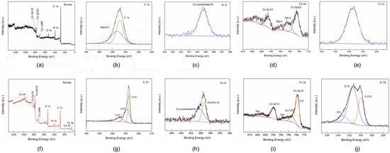XPS results: (a) the surveys of all chemical elements in ZIF−67@CF; (b–e) the peaks of C 1s, N 1s, Co 2p, and O 1s in ZIF−67@CF, respectively; (f) the surveys of all chemical elements in Co−CN@CF; (g–j) the peaks of C 1s, N 1s, Co 2p, and O 1s in Co−CN@CF, respectively.