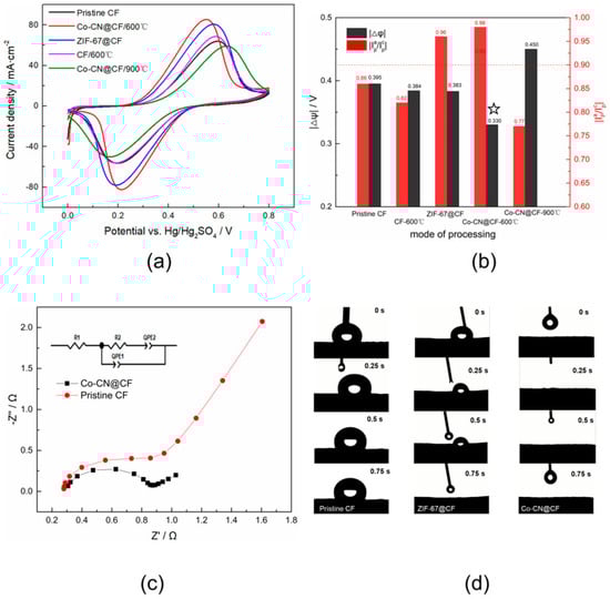 The wettability of the Co-CN@CF and ZIF-67@CF was better than that of the pristine CF. As shown in Figure 5d, the contact angle of the pristine CF was >90°, and the Co-CF@CF and ZIF-67@CF were superhydrophilic. With the increase in the -OH functional group on the surface of CF, the wettability of the CF increased, and the wettability of the Co-CN@CF was better than that of the ZIF-67@CF. This caused the electrolyte to react on the CF faster and more efficiently.