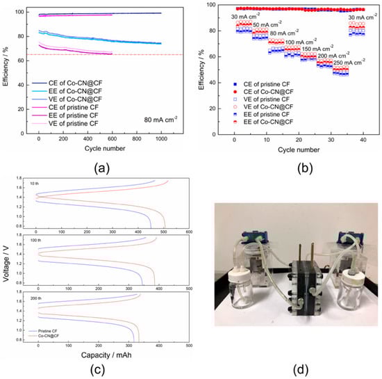 A charge–discharge test and rate performance of the single cells were implemented in a redox flow battery (Figure 6d) that was designed by our laboratory in order to further understand the effect of the Co-CN catalyst on the electrochemical performance of the CF. As shown in Figure 5a, lifetime tests were further carried out to study the long-term stability of the cells using different membranes. The tests were terminated when the VE decay reached 65%. The cell with a CO-CN@CF electrode exhibited an initial VE of 86%, and maintained stability (about 75% after 1000 cycles) during the entire cyclic process, whereas the cell with the pristine CF electrode declined from 75% to 65% at only 600 cycles, as shown in Figure 6a. Similarly, the EE slightly dropped from 84% to 73% in the cell with the CO-CN@CF electrode after 1000 cycles (over 400 h), whereas the cell with a pristine CF electrode decreased from 74% to 64% in just 600 cycles (about 150 h).