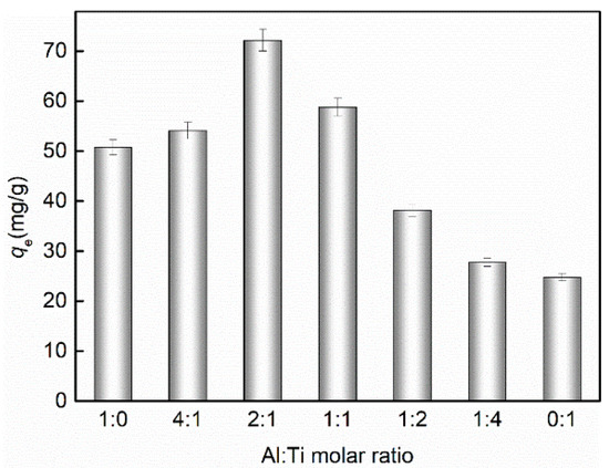 Comparison of phosphorus adsorption using sorbents with different Al and Ti molar ratios, initial pH of 6.8, initial P concentration = 50 mg/L, adsorbent dosage = 0.2 g/L, T = 298 K.