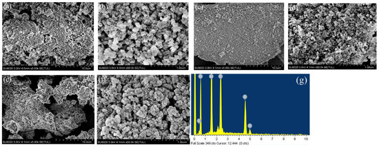 SEM photograph of Al-Ti oxide sorbent: (a) 5000×, (b) 50,000×; Al-oxide (c) 5000×, (d) 50,000×; and Ti-oxide (e) 5000×, (f) 50,000×; (g) EDS of photograph of Al-Ti oxide.