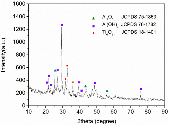 The XRD pattern of the sorbent with an Al-Ti molar ratio of 2:1 is shown in Figure 3. The presence of Al2O3 in the adsorbent corresponds to the diffraction peaks of 2θ = 25.6°, 43.4°, and 57.5° for the (012), (113), and (116) crystal planes, respectively (JCPDS card no. 76-1782). The diffraction peaks at 20.6°, 22.0°, 22.7°, 27.0°, 39.5°, 41.9°, 47.6°, and 76.2° can be assigned to the (200), (110), (111), (211), (312), (114), (313), and (135) crystal planes of Al(OH)3, respectively (JCPDS card no. 75-1863). The peaks at approximately 31.6°, 33.3°, and 36.0° were confirmed as the (026), (022), and (124) crystal planes of Ti6O11, respectively (JCPDS card no. 18-1401). These data indicate that Al-Ti oxide was successfully combined to form a hybrid material through the co-precipitation method.
