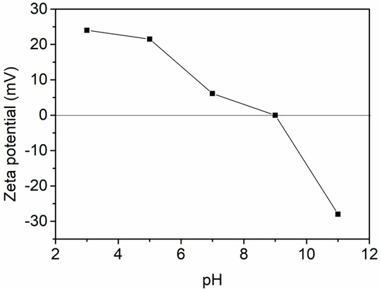 The Al-Ti oxide used after P adsorption was regenerated with 0.1 M NaOH solution. For the regenerated sample, the characteristic bands for O-H groups and the Al-OH group were recovered; the peaks for P groups at 1216 cm−1 and 1150 cm−1 were greatly weakened. Little to no change in the many peaks of the regenerated sample was observed compared with the as-prepared Al-Ti oxide. This indicates that the adsorption performance of P onto Al-Ti oxide could be recovered by regeneration with the NaOH solution. The zeta potential curve of Al-Ti oxide was presented in Figure 5, which indicates that the point of zero charge (PZC) is about zero at pH 8, and that the charge is in the range from 24 to −28 mV at pH 3−11. Therefore, this should be a stable absorbent toward cationic adsorbate because of its slight basic pHPZC and relatively large positive potential in neutral solution.