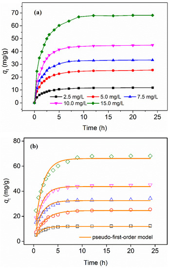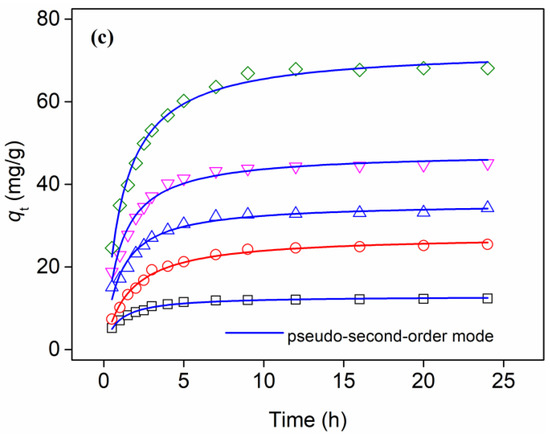 The fitting of the two kinetic models for P adsorption with various initial concentrations are shown in Figure 7b–c. Kinetic parameters fit by the pseudo-first-order and pseudo-second-order models were calculated and are listed in Table 2. The coefficients of determination (r2) of the pseudo-second-order model were higher than those of pseudo-second-order mode, and the calculated qe values were in good agreement with experimental results, verifying that the adsorption process could be better described by the pseudo-second-order model.