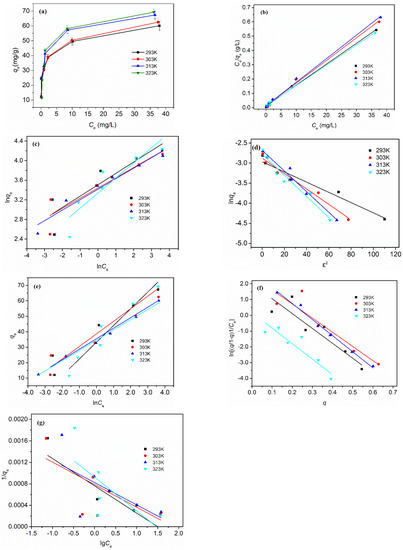 Adsorption isotherms are significant for describing the interaction between adsorbate and adsorbent, and for optimizing the employment of adsorbents. Thus, the analysis of equilibrium isotherms is fundamental for evaluating the adsorption mechanism. P adsorption isotherms at 293 K, 303 K, 313 K, and 323 K obtained by varying equilibrium concentration (Ce) are illustrated in Figure 8a. The initial P concentrations were 2.5, 5.0, 7.5, 10.0, 15.0, and 50.0 mg/L, and the P adsorption capacities increased with an increase in initial concentration. Higher adsorption capacity was also achieved at higher temperatures, which reveals the greater mobility of P in solution and higher probability of collision between adsorption sites and PO43− ions [44]. The fitting of experimental data to six different isotherm models is shown in Figure 8b–g; the estimated parameters for each model are summarized in Table 3.