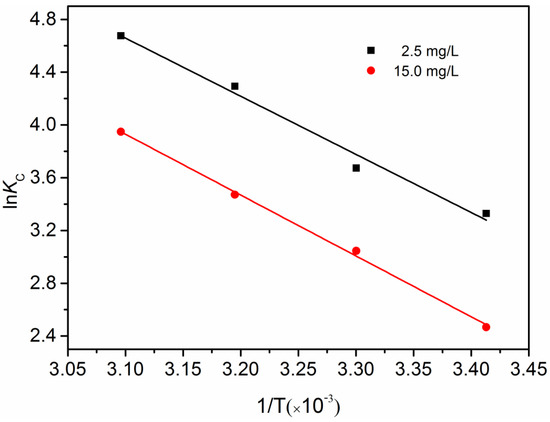 where CA and CS are the equilibrium concentrations of P on Al-Ti oxide adsorbent (mg/L) and in solution (mg/L), respectively [41]. Standard enthalpy (ΔH) and entropy (ΔS) of adsorption can be estimated from van’t Hoff equation (Equation (21)):