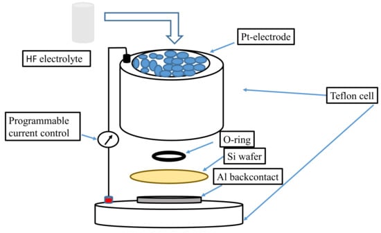 The electrochemical procedure is considered one of the most versatile techniques to synthesize silicon nanoparticles (SiNPs). The procedure involves the filling of a Teflon cell with a mixture of aqueous hydrofluoric acid (HF) and ethanol, subsequently followed by etching of a silicon wafer carried out under steady current supply, as shown in Figure 3 [28]. The reaction mechanism of diluting HF for silicon wafer etching is presented below: