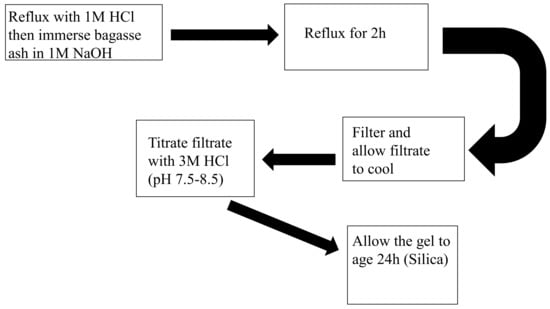 Therefore, 1 M is used for pre-treatment shown in Figure 5, in a water bath and heated at 75 °C. The sample is subsequently filtered numerous times to discard metallic ions and further dried in an oven. The as-obtained sugarcane bagasse ash is then immersed in 1 M and refluxed for an hour at 90 °C to produce sodium silicates solution from the sugarcane bagasse, as shown in the following equation [33,34].