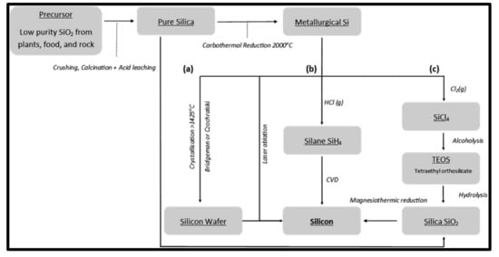Carbothermic reduction is traditionally an industrial procedure used to manufacture-grade silicon dioxide in an electric arc furnace according to the simplified reaction Equation (19) below. The method involves high temperatures (2000 °C) and high-energy consumption, shown in Figure 6. The flow chart displays the processes involved to get high purity silica from precursor materials to silicon, using the synthetic reduction routes. Some other methods involve tetrafluoride shown in (20) similar to (c) and (b) decomposition of silane (22), however, they might not be economically viable [42,43,44].