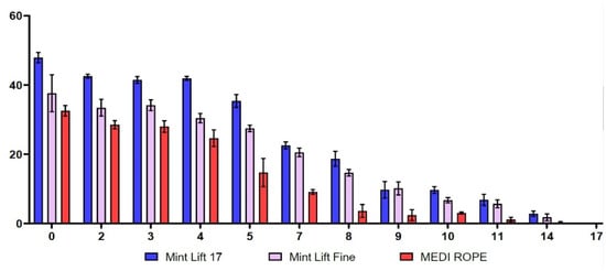 Time-dependent changes in the thermal stability. Between 0 and 14 weeks, the Mint Lift® 17 and the Mint Lift® Fine had significantly higher degrees of strength as compared with the MEDI ROPE (p < 0.05). (X- and Y-axis indicate the time and the strength (N), respectively).