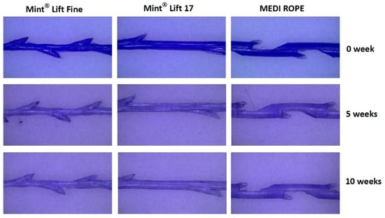 To summarize, our results are as follows: First, between 0 and 14 weeks, the Mint Lift® 17 and the Mint Lift® Fine had significantly higher degrees of strength as compared with the MEDI ROPE (p < 0.05). Second, at 0, 5, and 10 weeks, the Mint Lift® 17 and the Mint Lift® Fine showed no notable differences in microscopic findings as compared with the MEDI ROPE. Third, at 20 weeks, the integrity of the Mint Lift® 17 and the Mint Lift® Fine was better preserved as compared with the MEDI ROPE.