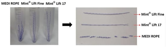 The MEDI ROPE, the Mint Lift® 17, and the Mint Lift® Fine were cut at a length of 4.5 cm and then weighed. Thus, the MEDI ROPE (0.014 g), the Mint Lift® 17 (0.009 g), and the Mint Lift® Fine (0.009 g) were prepared for the current experiment.