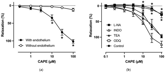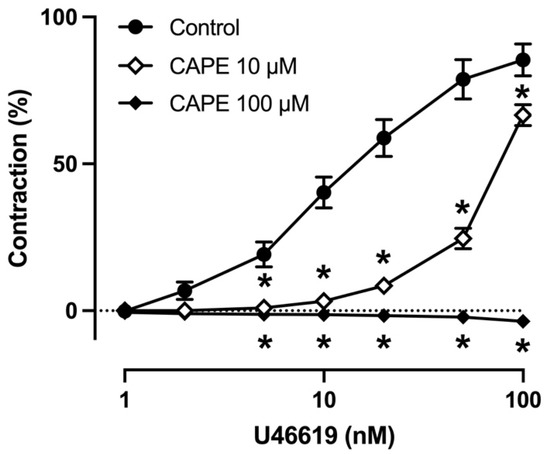 3.2. CAPE Causes Endothelium-Dependent NO-Mediated Vasorelaxation and Inhibits U46619-Induced Vasoconstriction in Porcine Coronary Arteries
